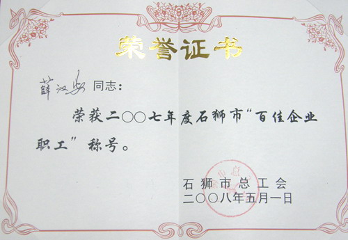 | 薛漢安同志榮獲2007年度石獅市“百佳企業(yè)職工”稱號 |