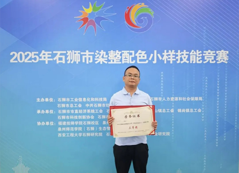 5月25日,2025年石獅市染整配色小樣(紡織染色工)技能競(jìng)賽在福建技師學(xué)院寶蓋校區(qū)舉行。該競(jìng)賽是石獅紡織服裝行業(yè)的常態(tài)賽事,也是2025年泉州市科技活動(dòng)周暨石獅市科技、人才活動(dòng)周和全國(guó)科技工作者日活動(dòng)的系列活動(dòng)之一,著重考驗(yàn)參賽選手的配色及調(diào)色能力。 比賽項(xiàng)目分為A、B兩項(xiàng),根據(jù)參賽者實(shí)際情況自由選擇A項(xiàng)或B項(xiàng)。其中,A項(xiàng)為長(zhǎng)車軋染工藝及操作、B項(xiàng)為浸染工藝及操作。經(jīng)過(guò)兩輪激烈角逐,最終我司員工邱尚東榮獲三等獎(jiǎng)。