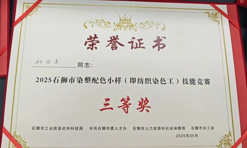 熱烈祝賀華寶集團(tuán)旗下石獅市豪寶染織有限公司員工邱尚東獲得2025石獅市染整配色小樣(即紡織染色工)技能競(jìng)賽三等獎(jiǎng)。